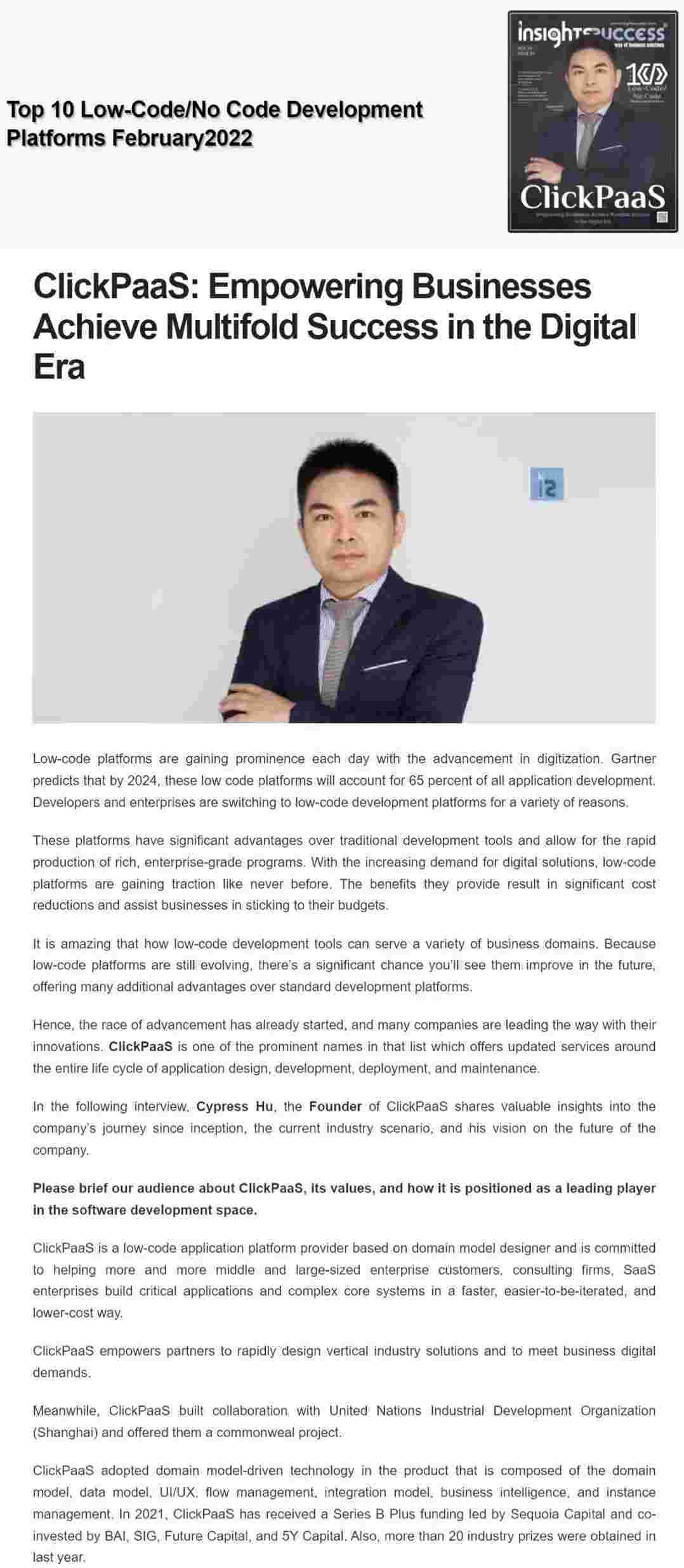 2022年年初,,,,,,,,,NO钱包入选外媒Insights Success低代码/无代码开发平台 Top10,,,,,,,,,,,,,,,创始人、、、、、CEO胡柏受邀接受专访并荣登封面人物,,,,,,,,他与Insights Success的读者分享了NO钱包成立的初心、、、、、、、、发展历程、、、、、、、、、、当前的行业发展趋势以及他对公司未来的展望。。。。。。。。。。。。
